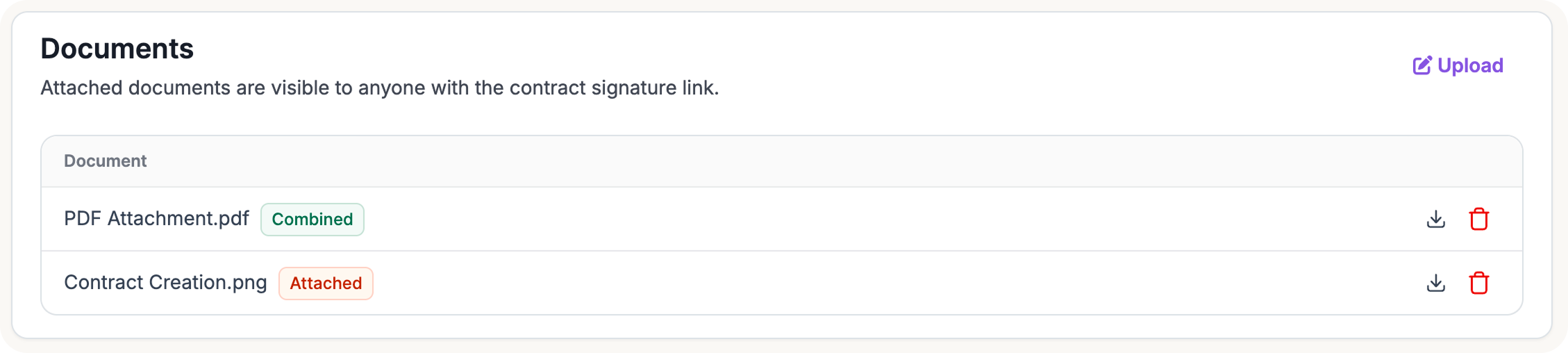 Aside from being displayed in the attachments area, PDF and Word attachments can also be merged with the main contract document to form one unified document. More on this in this section: Merging PDFs and Word Files with the Contract Document.